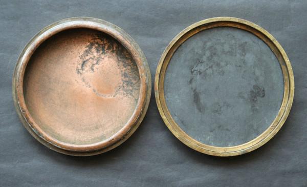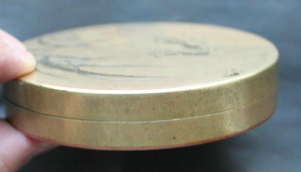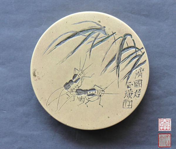 那之后的第四年,我又参加了上海工美的大石斋之友珍藏拍卖会,此次拍卖中又有两件大石斋所藏的刻铜文房珍品,其中一件是唐云先生最珍爱的齐白石亲笔草虫墨盒。经过二十多轮激烈竞价后,终于将白石墨盒入藏怀莲斋。此盒无论从艺术价值还是人文价值来看都可谓极品,各位藏友且听我慢慢道来。