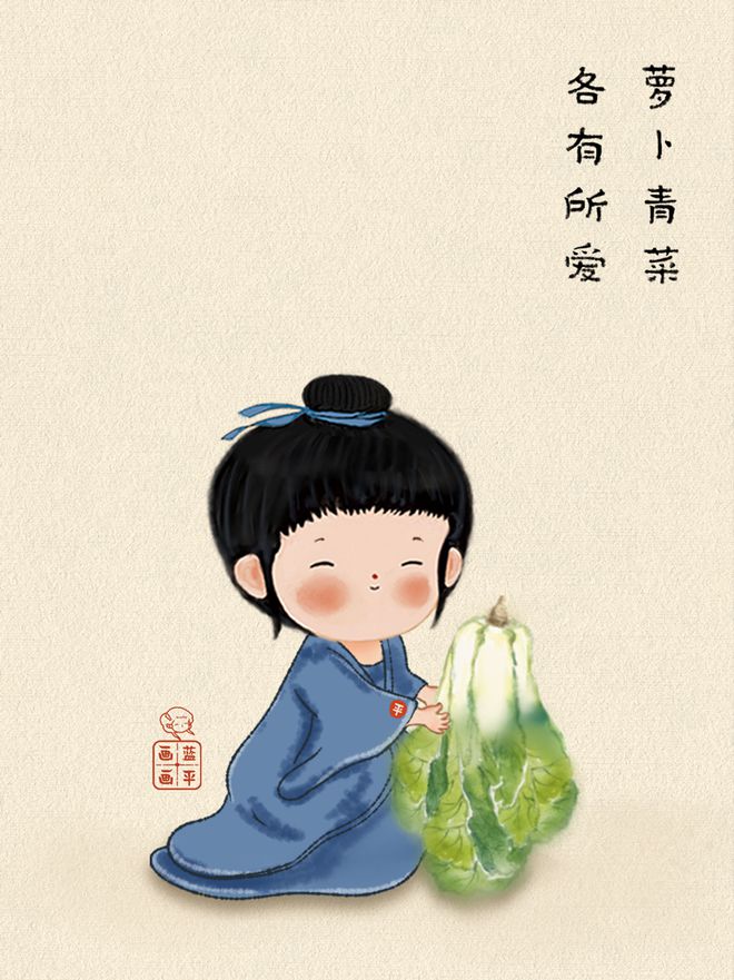 穿着蓝色衣服的古风小男孩笑眯眯地抱着一棵大白菜,仿佛那就是他心中所爱,是他的选择。人以类聚,物以群分,也不奢求别人都懂自己,也不用跟谁解释太多,懂得的人自会遇见。萝卜青菜只是种比喻,其实都有各自的营养价值,现实生活里,还是多交流、多理解,营养均衡比较好。