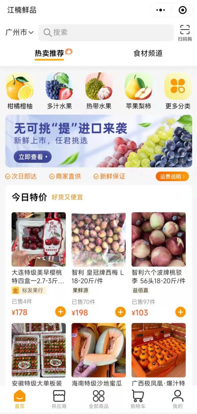 江南市场重点打造“江楠鲜品”电商平台,建立B2B垂直电商,帮助市场实体商户扩大销售渠道,推动市场线上线下一体化交易水平。