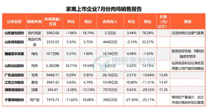 截至今日,益生、民和、圣农、杏彩体育官网注册仙坛、温氏、立华、湘佳、晓鸣8家家禽上市公司均已公布7月肉鸡销售情况。整体来看,益生、圣农、民和、仙坛收入和产能7月份表现抢眼。夏季是养殖行业的淡季,天热不仅会降低人们对肉类的消费需求,上游的饲养难度和成本也急剧增加。然而今年白羽肉鸡鸡苗、鸡肉行情淡季不淡,相比去年均有增长。黄鸡则表现一般,不过业内人士看好三、四季度行情。