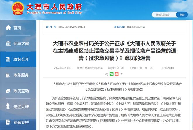 日前,大理市农业农村局发布关于公开征求《大理市人民政府关于在主城建成区禁止活禽交易宰杀及规范禽产品经营的通告(征求意见稿)》意见的通告。