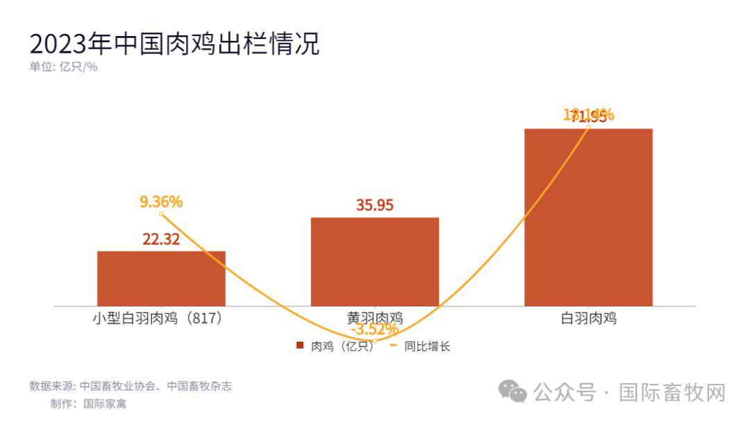 根据农业农村部对肉鸡养殖户月度定点跟踪监测数据及中国畜牧业协会监测数据分析,2023年肉鸡(包括白羽、黄羽和小型白羽肉鸡)总出栏数量130.22亿只,较2022年增加11.65亿只,增幅9.83%;肉鸡总产量为2152.36万吨,较2022年增加240.69万吨,增幅12.59%。