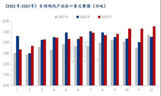 鸡肉产品出口量方面,2023年鸡肉产品出口量为55.41万吨,自2020年以来持续增长,较去年增加2.2万吨,环比涨幅4.13%。值得一提的是,从下图可以看出,今年整体出口量呈持续递增态势。一反往年4季度减量的状态。