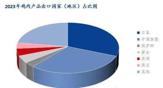 鸡肉产品出口国(地区)占比方面,2023年出口鸡肉产品共涉及54个国家或地区,日本和中国香港占据主要的出口区域,全年出口日本17.23万吨,占比31.11%;出口中国香港16.69万吨,占比30.12%。蒙古和英国则是排第3和第4,分别出口2.54万吨和2.59万吨占比4.59%和4.68%;形成断崖式差距。