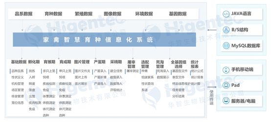 华智生物家禽智慧育种信息化系统由孵化期、育雏期选择、育成期选择、产蛋期选择、采精期选择、屠宰测定、家系组建及选配等7个模块组成,每个模块为一个子系统,各子系统均可独立对相关数据进行采集、分析和共享。当上一育种过程结束后,选留个体数据进入下一过程,直至整个选育期结束,该家禽世代的所有育种信息转存至亲代数据库,并支持在子代选育时调用该数据。选育过程中自动更新系谱,并可追溯个体选育中的采集信息。
